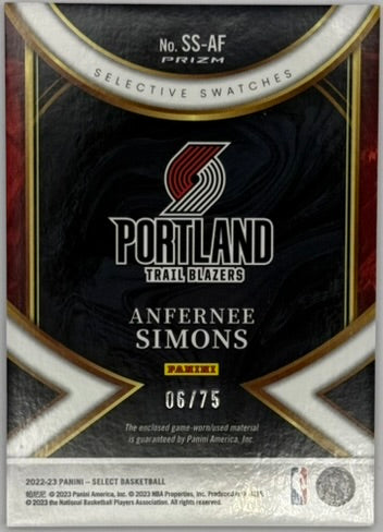 Set/Year/Brand: 2022-23 Panini Select | Card #: SS-AF | Player: Anfernee Simons | Team: Portland Trail Blazers | League/Sport: Basketball | Notes: Game-worn jersey patch, serial #06/75